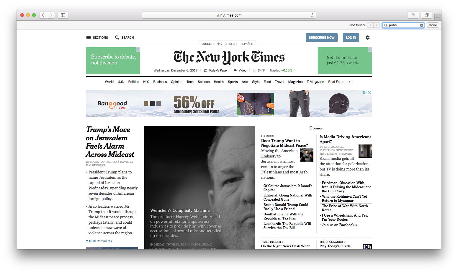 На главной странице NYT Путин не упоминается ни разу.