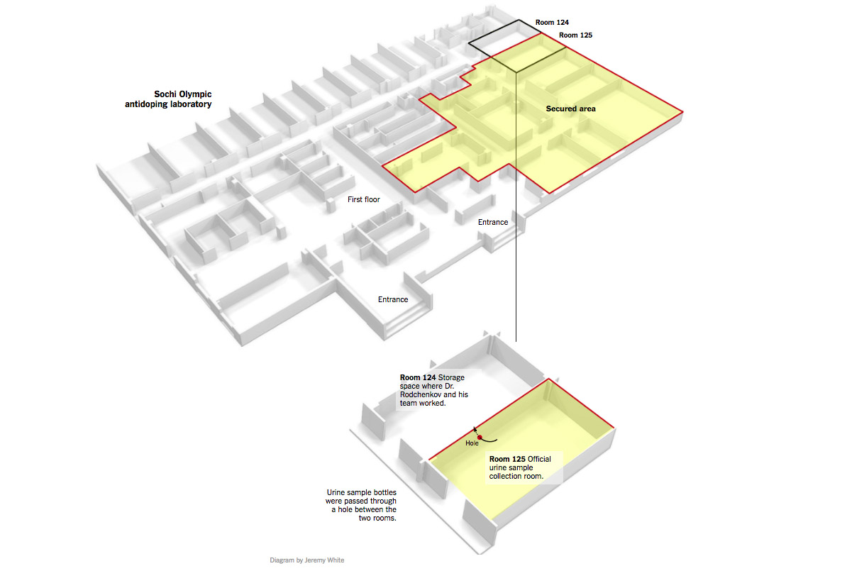 Получив сигнал, обычно после полуночи, Родченков отправлялся в комнату 124, которая находилась по соседству с местом сбора образцов (комната 125), где хранились заветные бутылки с мочой. Официально комната 124 была обозначена как склад, но Родченков и его команда превратили ее в лабораторию.