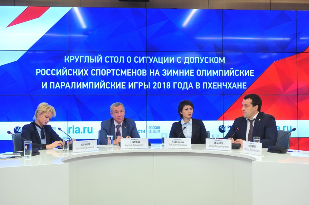 Круглый стол о ситуации с допуском российских спортсменов на зимнюю Олимпиаду-2018 Сергей Киселев / АГН "Москва" «Это абсолютно неприемлемо и совершенно точно унизительно для любого атлета, который гордится тем, что выступает за свою родину и является гражданином своей страны. Российским спортсменам придётся выступать на Олимпийских играх под нейтральным флагом и без национального гимна. Правда, это ограничение распространяется только до последнего дня турнира. Предполагается, что в последний день все они будут с ОКР сняты. В таком случае на церемонии закрытия Игр российские спортсмены смогут пройти под российским флагом вместе со всеми», – приводит сайт телеканала RT реакцию президента ОКР Александра Жукова.