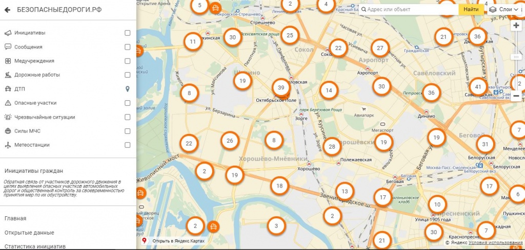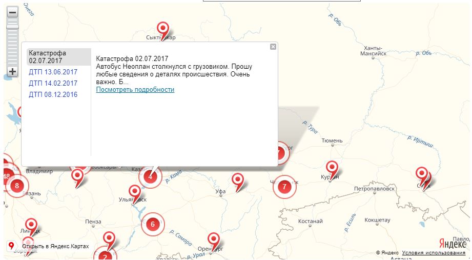 Карта довольно наглядная. Можно увеличить каждую оранжевую точку на карте и тогда откроется карточка ДТП: время происшествия, сколько человек погибло и ранено.
