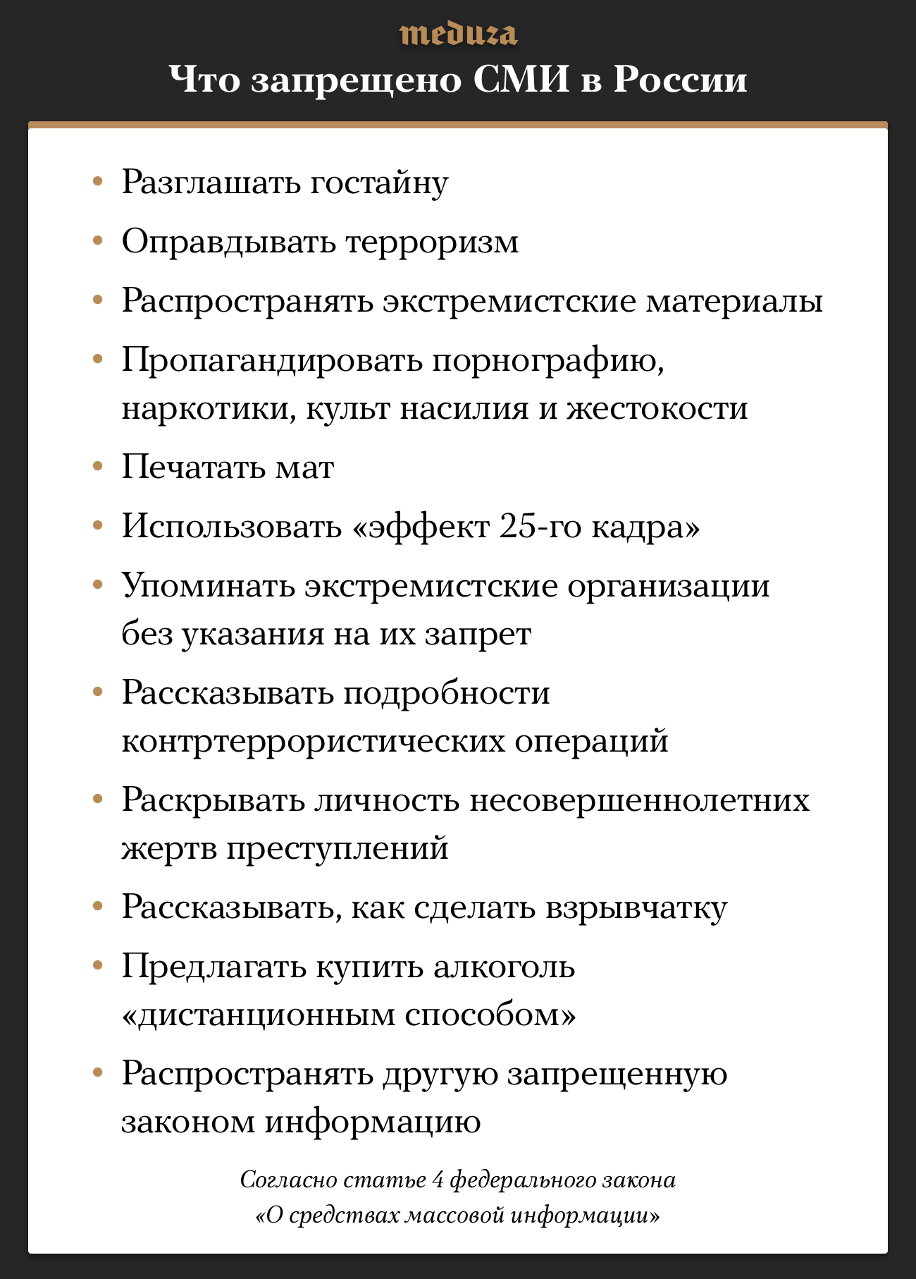 Удельный вес нарушений, совершенных в СМИ, не так велик. Например, за 2016 год РКН 2277 раз обращался к различным редакциям с требованиями удалить или отредактировать комментарии читателей — в основном в них содержалась нецензурная брань, некоторые проходили по категории «возбуждение национальной розни». Еще 66 предупреждений касались непосредственно редакционного контента, нарушавшего закон о СМИ (если одно издание получает два таких предупреждения в течение года, РКН имеет право подать иск о том, чтобы лишить его лицензии СМИ). Опять же чаще всего речь шла об использовании нецензурной лексики; в ряде случаев издания обвиняли в незаконном разглашении персональных данных несовершеннолетних. Всего за 2016 год российские СМИ заплатили штрафов на 5,9 миллиона рублей.