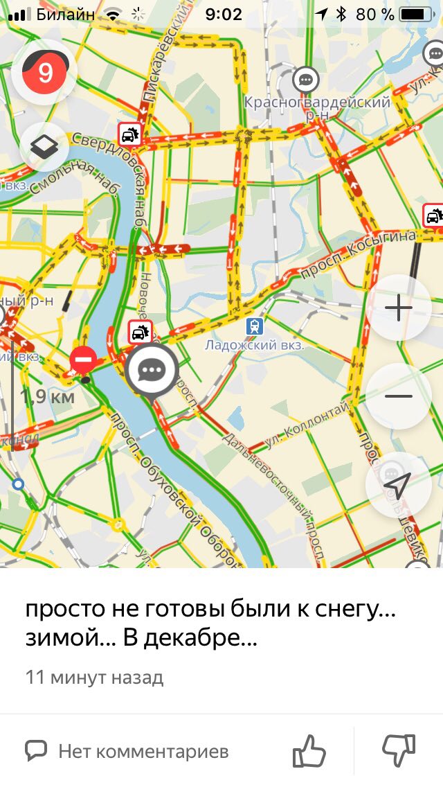 К 8:56 пятницы на дорогах Петербурга сильная загруженность из-за снегопада и метели. Сервис «Яндекс.Пробки» показывает, что заторы достигли девяти баллов.