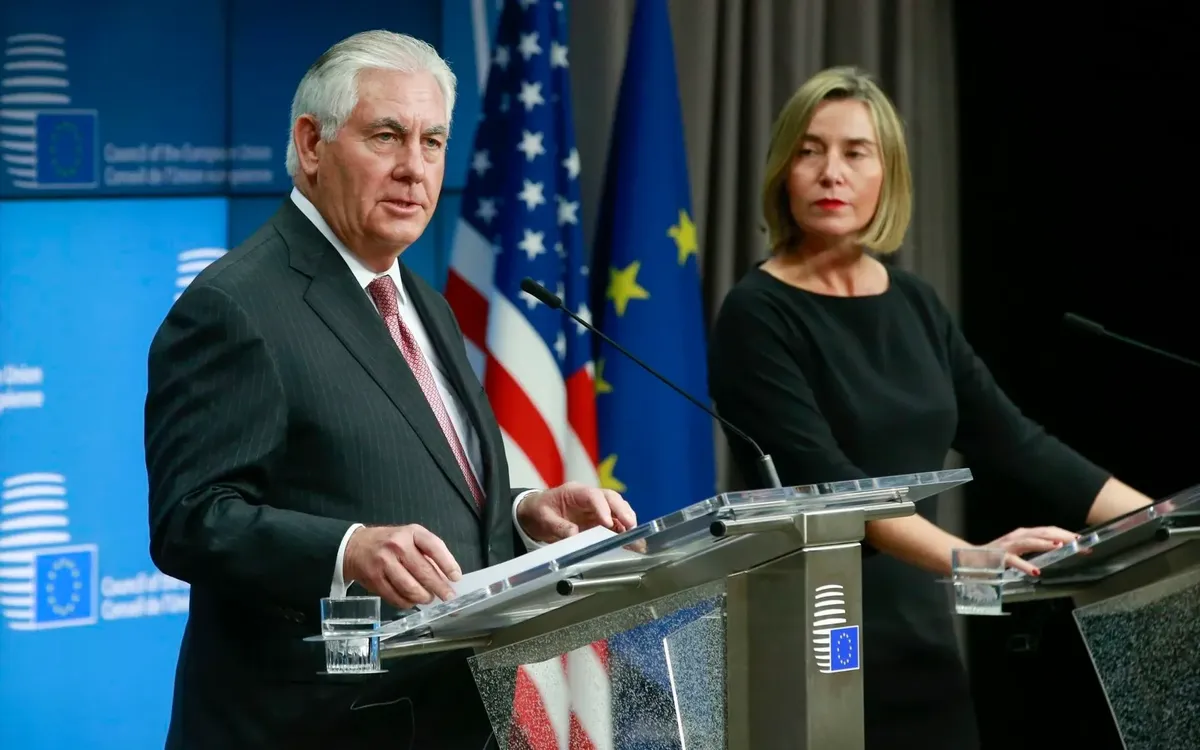 Федерика Могерини и Рекс Тиллерсон пришли в пресс-центр ЕС с наклеенными улыбками, чуть скрывавшими озабоченность и напряжение. Во всяком случае, были не в лучшем настроении.