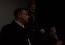 "Прекращайте показ фильма! Фильма не будет такого, где убивают русских!" - кричал лидер SERB Игорь Бекетов (Гоша Тарасевич), забравшись на возвышение перед экраном.