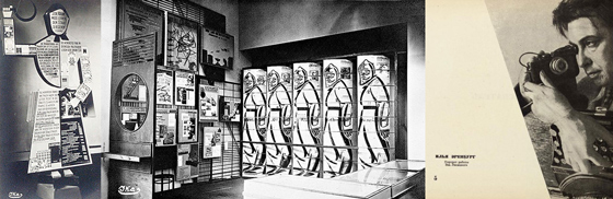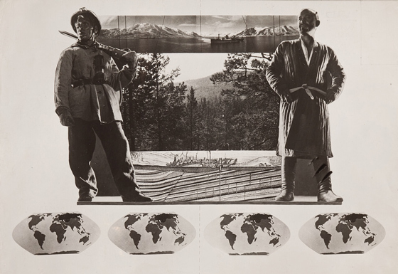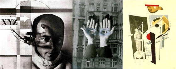 Гибридами человеческой природы и роботизированной машины становятся и выставочные конструкции Лисицкого. В Кельне на выставке «Пресса» 1928 года «архитектор-инженер» Лисицкий демонстрирует динамические «объемные установки» и гигантские фотомонтажи (фотовитражи, фотофризы). Инсталляция «Красная Армия» была составлена из пяти поворачивающихся щитов, подсвеченных изнутри и оклеенных военной прессой, поверх которой были изображены ростовые фигуры красноармейцев. На стене, перебиваемое треугольными флажками, было развернуто фотопанно размером 24 на 3,5 м с плакатным монтажом Лисицкого и художника Сергея Сенькина. Особенно сильным, практически эсхатологическим, образом выглядит плоскостная фигура женщины в платке: замахнувшись серпом и взвешивая в руке молот, она предлагает зрителю прочесть текст о работницах-крестьянках в СССР, которым буквально испещрена вся поверхность ее «тела», а на лице размещена культовая фраза Ленина о роли кухарки в государстве. В 1930-м на выставке «Гигиена» в Дрездене Лисицкий показывает фотомонтаж «Строительство социализма», где в мужской груди двое рабочих конструируют каркас сферы-глобуса. В качестве иллюстрации к книге Ильи Эренбурга «Мой Париж», вышедшей в 1933 году, Лисицкий помещает портрет автора с двойной, практически эшеровской, рукой: в одну ладонь Эренбурга Лисицкий вкладывает фотоаппарат, а другая ударяет по клавишам печатной машинки.