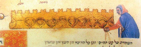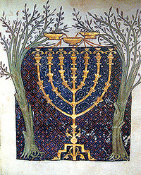 Зажигание синагогальной ханукии. Фрагмент миниатюры манускрипта Ротшильда, 1470 год
