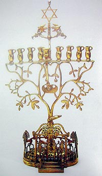 Своей конструкцией ханукия призвана напоминать о чуде, произошедшем с храмовым семисвечником. В декоре одной из восточно-европейских ханукий XIX века каждый из восьми подсвечников исполнен в виде стилизованного кувшинчика для оливкового масла. Традиционно же храмовая менора всегда сравнивалась с райским Древом жизни. И именно в соответствии с этой метафорой основание лампы представляет собой огражденный райский сад. Наиболее интересной деталью является здесь змей, обвившийся вокруг ствола и намекающий на историю с плодом Древа познания. В результате получается сложная игра ассоциаций: ствол светильника объединяет в себе символику двух райских деревьев — Древа жизни и Древа познания, а свечи воплощают победу в противостоянии добра и зла, которое зародилось на заре человеческой истории.