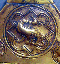 Еще одним излюбленным героем средневековых маргиналий был змей или дракон. Вытесненный на границу текста, он олицетворял поверженные силы зла. Такой дракон появляется и в центральном медальоне ханукии XIII века из Германии. В меньших медальонах по обе стороны от дракона изображены львы. Эти образы намекают, прежде всего, на цитату из Книги псалмов: «Будешь попирать льва и змея, растопчешь молодого льва и дракона» (91:13), относящуюся к праведному человеку, полагающемуся на Всевышнего и охраняемого ангелами. Однако дракон связан и с темой огня, что делает его возникновение на ханукальном светильнике неслучайным. Дело в том, что в виде крылатого дракона рисовали медного змея, изображение которого было создано Моисеем в пустыне по приказу Всевышнего — для исцеления евреев от укусов ядовитых змей (Числа, 21:6-9). В Пятикнижии он назван «сараф» — «сжигающий», «жалящий». Такое же имя носят и огненные ангелы, известные в русской транскрипции как серафимы. Дракон на ханукии намекает на разрушительную силу огня, в то время как ханукальный свет олицетворяет огонь созидающий.