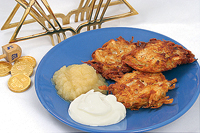 Картофельные латкес — классическое ханукальное блюдо. Очень вкусно с яблочным соусом. Понадобится 5 больших картофелин, 1 большая луковица, 4 яйца, 1/4 чашки молотой мацы или муки, соль и перец по вкусу.