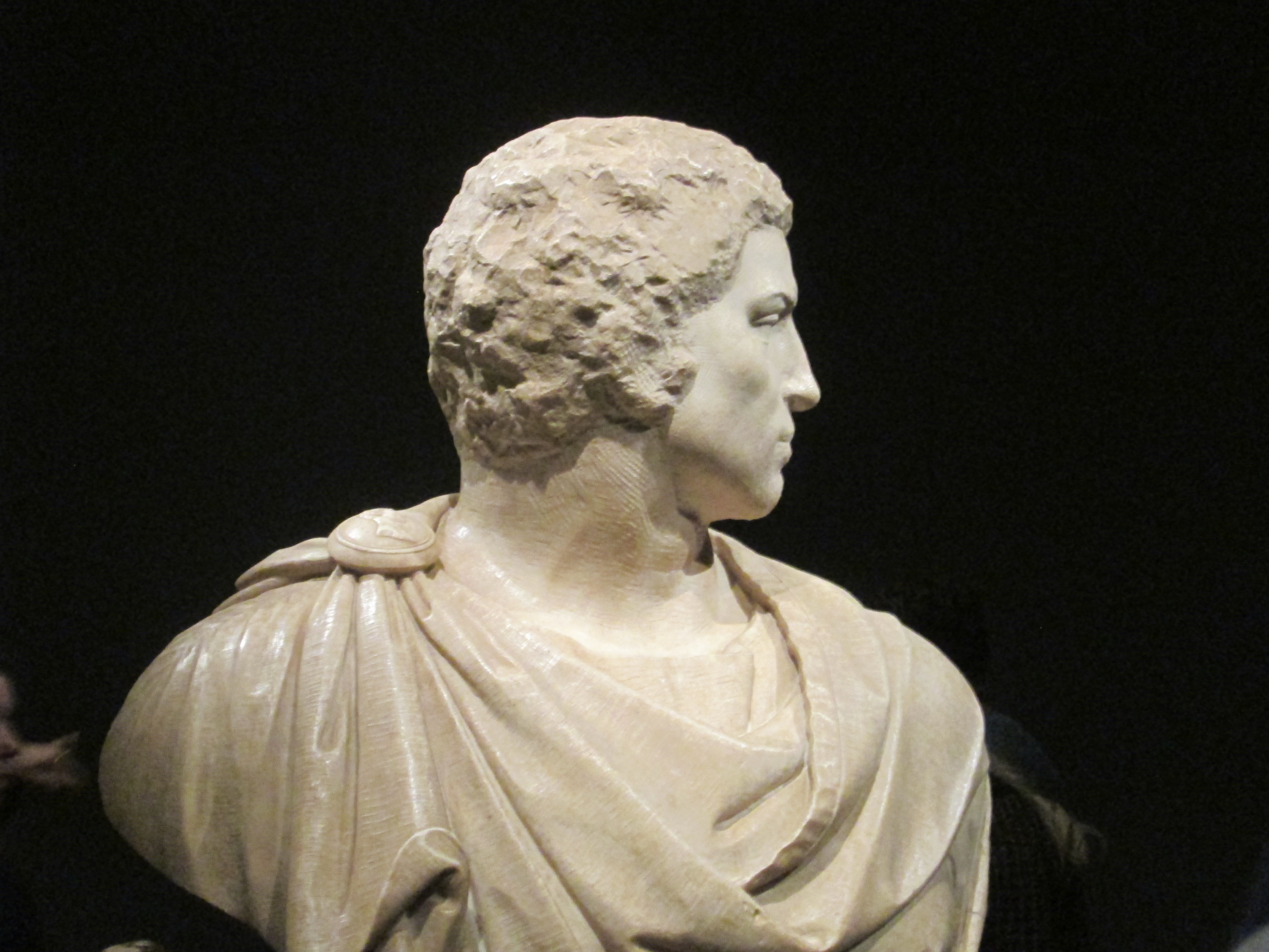 Выставка в “Метрополитен” устроена с редким размахом. Даже копия потолка Сикстинской капеллы вместилась в зал рисунков-прототипов к божественной эпопее. Но собственно скульптур в экспозиции немного. Но одна из них очень интересна. Это – портрет Брута. Для контраста кураторы рядом с ним поставили два других бюста. Один – античный, императора Каракаллы, другой – ренессансный, Юлия Цезаря. Сразу ясно, что второй подражал первому – та же проработанность деталей, изысканная лепка лица. Зато Микеланджело резко возражал традиции. Его Брут – грубое воплощение непреклонной воли. Вся она сконцентрирована не в лице, а в повороте могучей шеи.