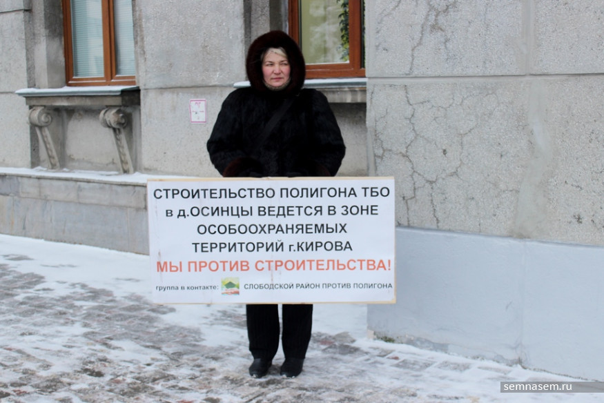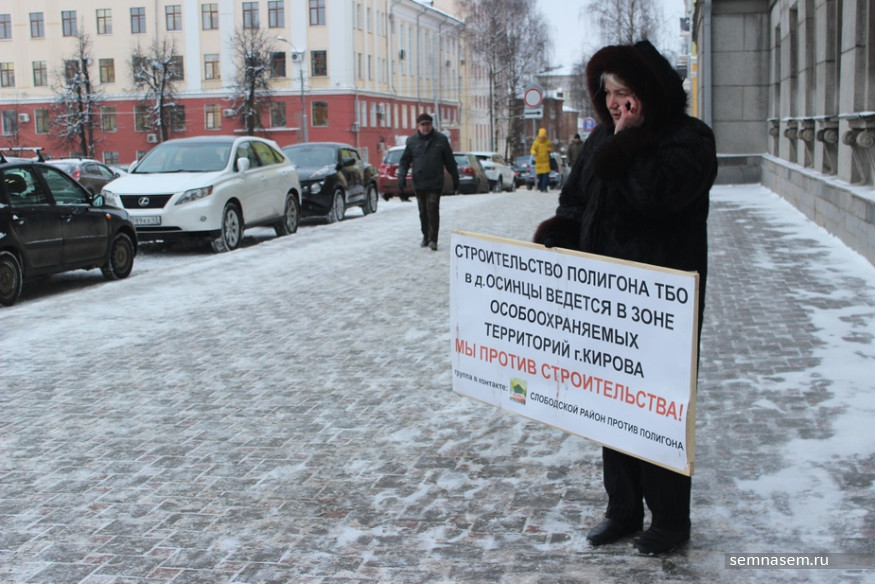 Член общественной организации «Среда обитания» и активистка Татьяна Столбова 12 декабря вышла к зданию правительства с одиночным пикетом против строительства полигона около деревни Осинцы в Слободском районе. Она собирается простоять на морозе с 09:00 до 13:00. Корреспондент «7x7» спросил Татьяну Столбову, зачем она это делает и чем именно общественников не устраивает строительство полигона.