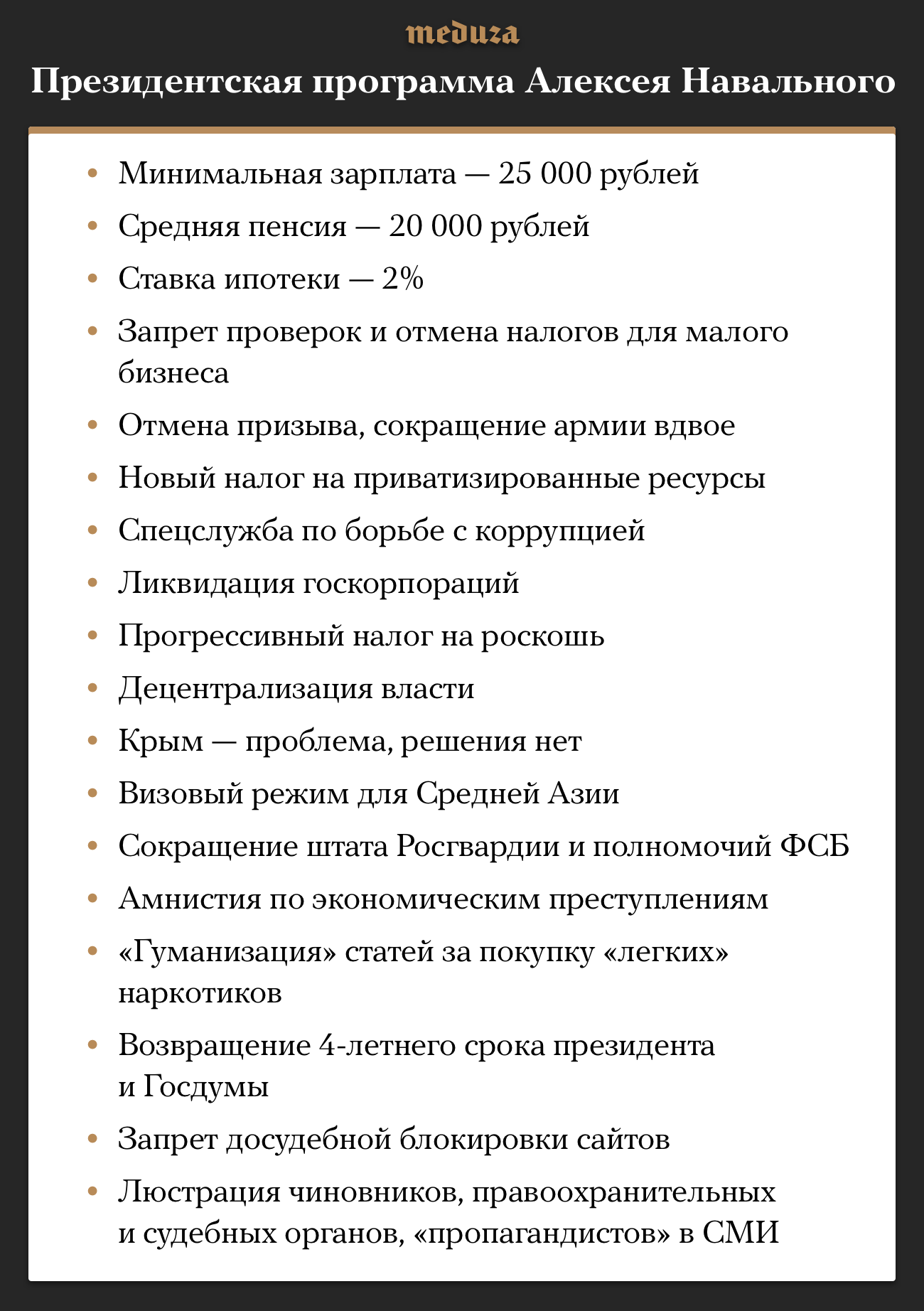 Алексей Навальный накануне начала президентской кампании опубликовал свою подробную предвыборную программу. В ней политик перечислил основные реформы и цели, которые он ставит перед собой. Полностью программу можно почитать здесь.