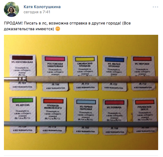 В конце ноября сеть ресторанов быстрого питания «Макдональдс» запустила акцию «Монополия», в которой разыгрывается 16 миллионов призов. Ее участники собирают стикеры двух видов: на одних написано название приза, который можно получить сразу же, на других — название улицы.