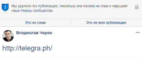 Редактор «Медузы» попробовал опубликовать ссылку на Telegraph, однако соцсеть сразу удалила пост «из-за подозрения на спам и нарушения норм сообщества». С таким же результатом закончилась проверка TJ. Ссылки блокируются и в мессенджере фейсбука с примечанием о том, что домен telegra.ph «зарегистрирован системой безопасности как небезопасный».