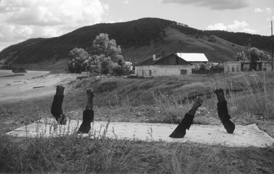 А мы случайно оказались во всей этой куче, у нас в то время была выставка в музее. Мы просто встретились, и все это закрутилось. В силу того, что в 2000-х мы уже пережили какое-то эстетическое и человеческое родство, расставаться не хотелось, и мы им сказали: «Давайте на следующий год тоже сделаем проект в Ширяеве». Это был настолько сильный опыт, что почти год все ходили как сумасшедшие. Название «Номадическое шоу» придумала я. По-моему, только в 2003 году, если не позже. Шел живой процесс, все складывалось на глазах, из внутреннего интереса. Не из эскапизма, а из желания высказаться. Нас никто не притеснял. Мы чувствовали себя дарителями: у нас была инициатива, и мы могли находить какое-то, пусть совсем маленькое, финансирование. Кстати, в первый год это был не только Штутгарт, но и Фонд Сороса. Вы, может, и не помните эту рамку. Тогда она существовала очень долго. С Казахстаном, с Хальфиным и другими у нас был достаточно плотный контакт в связи с идеями, над которыми мы до того работали, потому что наши художественные интенции лежали всегда в плоскости поиска формообразования и пустоты. Эта новая площадка и была этой пустотой, этим опытом. Хальфин как ученик Стерлигова, продолжающий линию беспредметного, понимал это. Стерлигов, уехав в Казахстан, в пустую землю, поставил чашу — купол небес — как продолжение «Черного квадрата». Он не мог этот опыт получить в Петербурге. Это невозможно там, где весь горизонт застроен домами, шпилями и вообще ничего этого нет. Оказавшись в пустоте, он делает такое визуальное открытие.