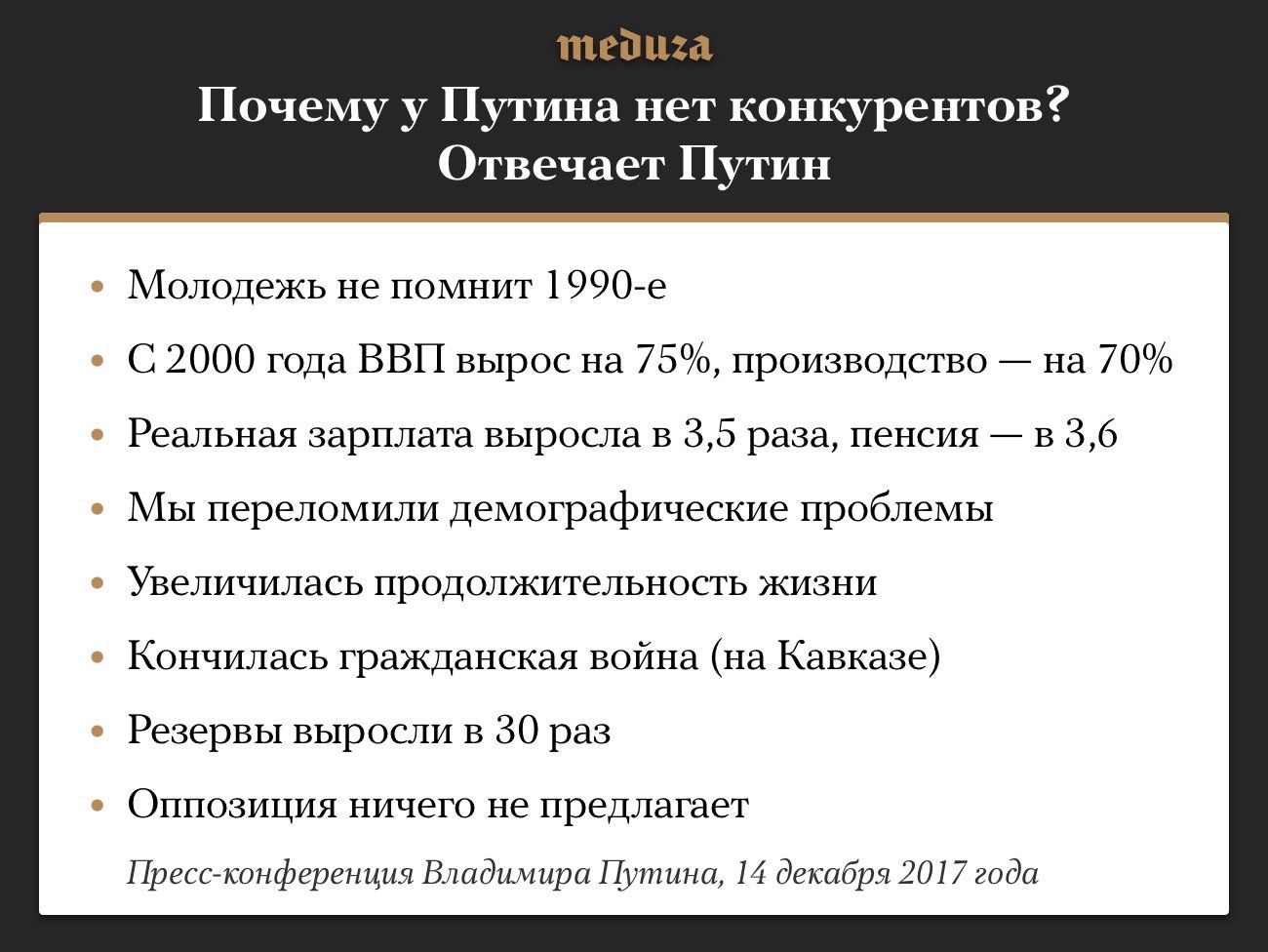 Пенсия выросла, смертность сократилась, все хорошо, в целом. Другими словами Путин хочет сказать, что и при нем все хорошо — никакие конкуренты ему и не нужны.
