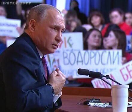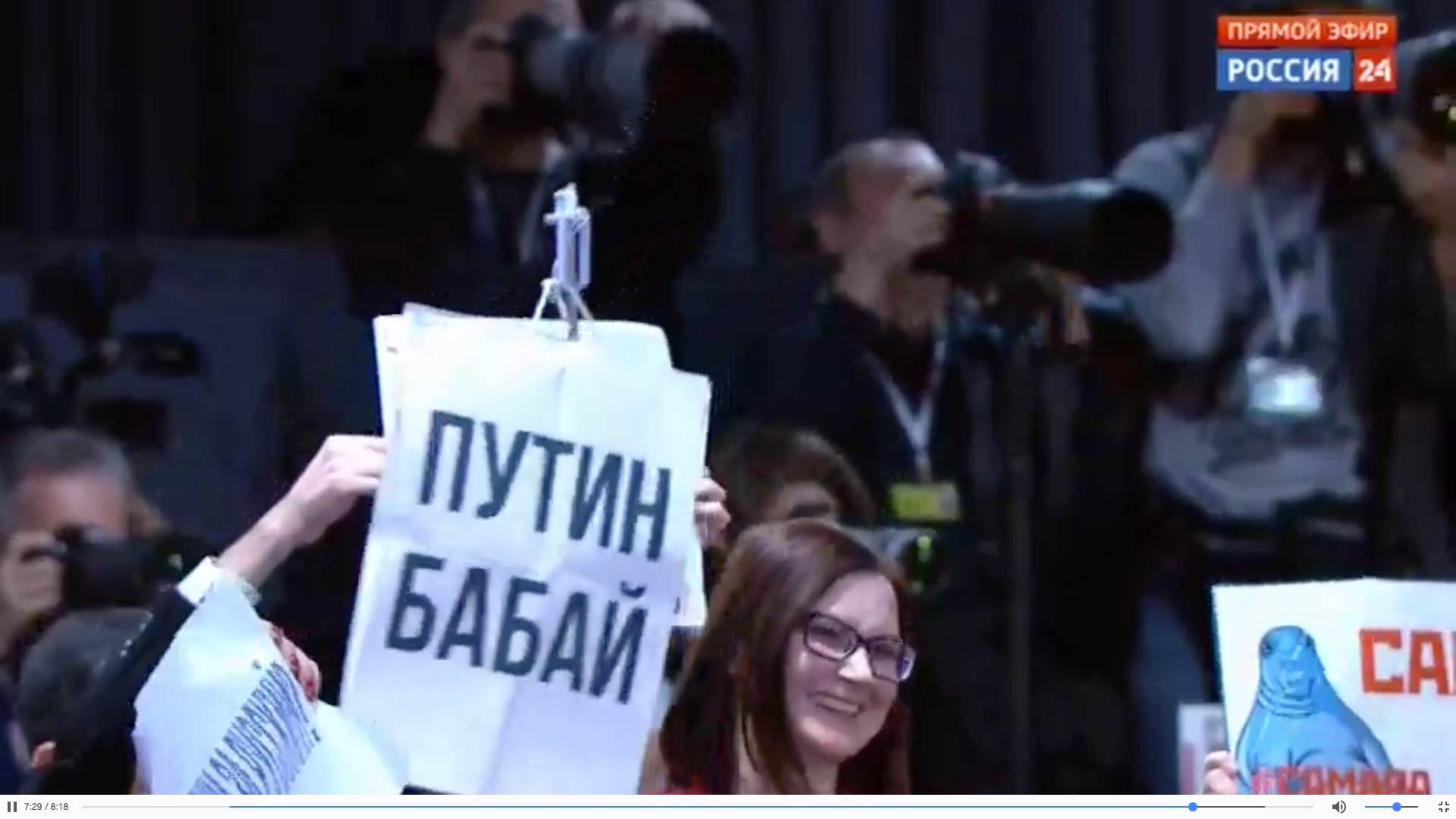 Путин предлагает для остроты еще хочет, чтобы задала вопрос девушка с плакатом «Путин байбай». Но на плакате написано «Путин — бабай». Это вопрос из Татарстана.