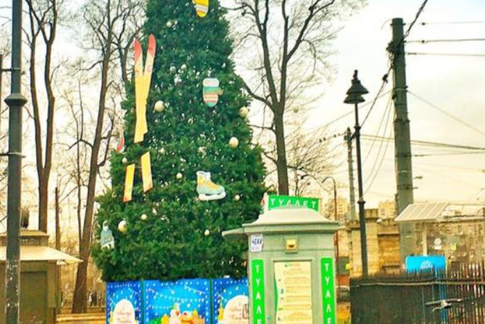 У метро «Черная речка» новогоднюю ель украсили игрушками в виде шапок, варежек и коньков. На дереве также заметили украшение, напоминающее сломанные лыжи.