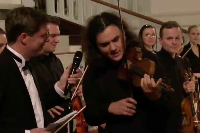 Петербургский музыкант и основатель Dogma chamber оrchestra Михаил Гуревич сыграл на скрипке гимн футбольного клуба «Зенит» на гала-концерте в Гамбурге.