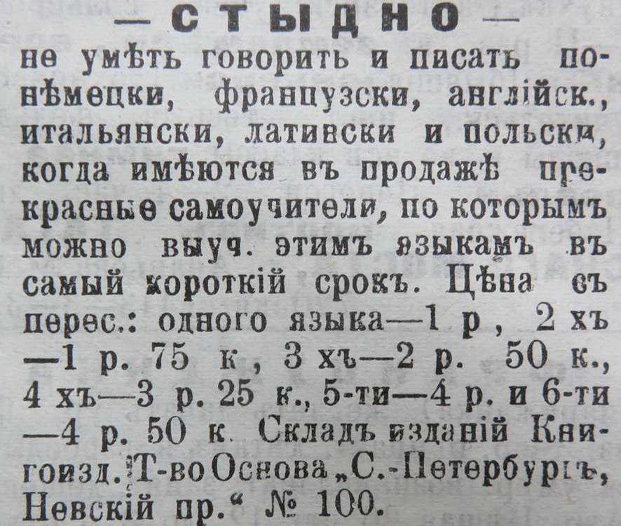 Стыдно не умѣть говорить и писать по-нѣмецки, французски, англiйск., итальянски, латински и польски, когда имѣются въ продажѣ прекрасные самоучители