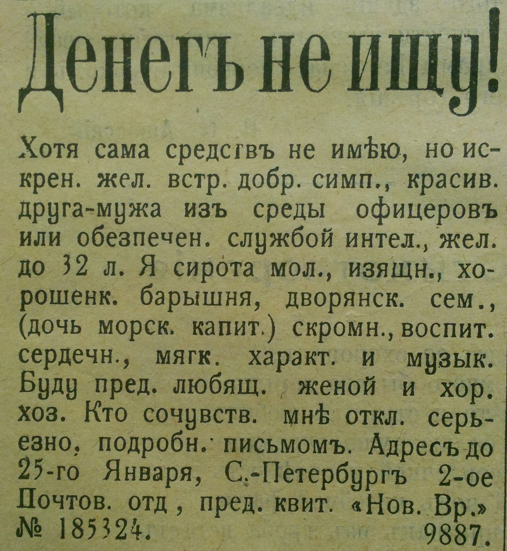 Я сирота мол., изящн., хорошенк. барышня, дворянск. сем., (дочь морск. капит.) скромн., воспит. сердечн., мягк. характ. и музык.