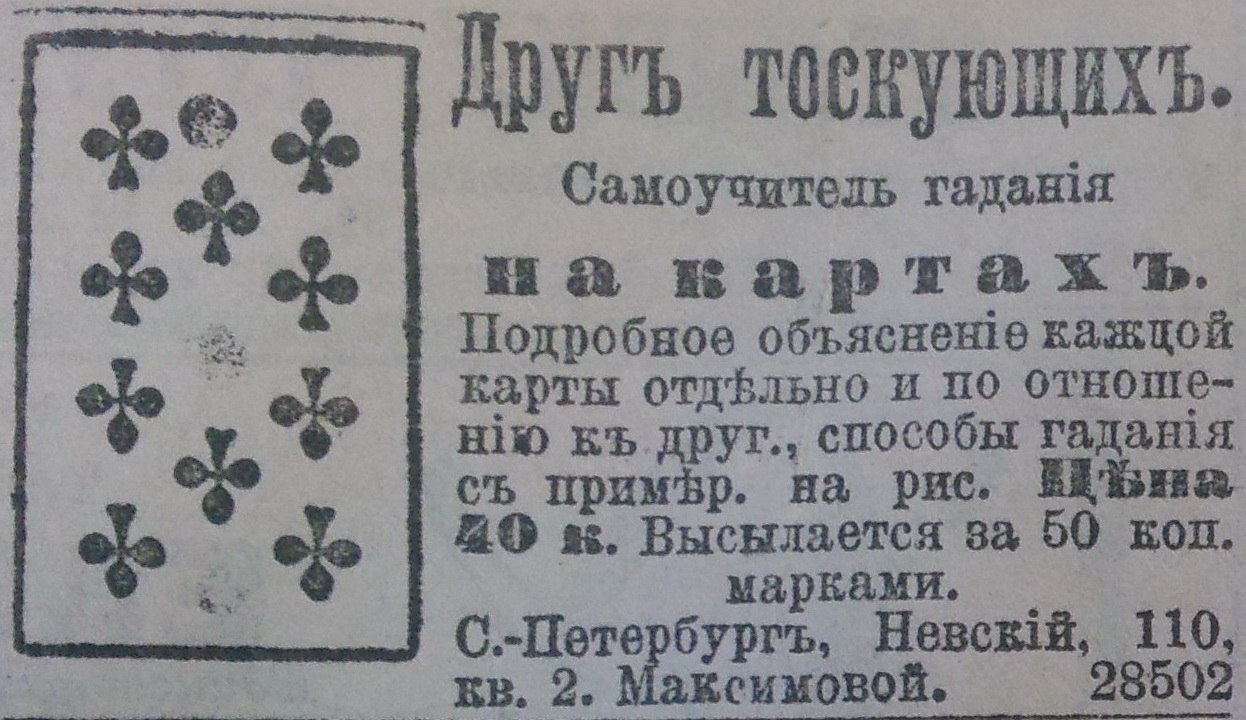 Где искать «карманное огниво» и самоучитель гадания, кто хочет встретить «друга-мужа» и какую книгу обещают не высылать ревнивым? «Бумага» собрала двенадцать петербургских объявлений конца XIX — начала ХХ веков.
