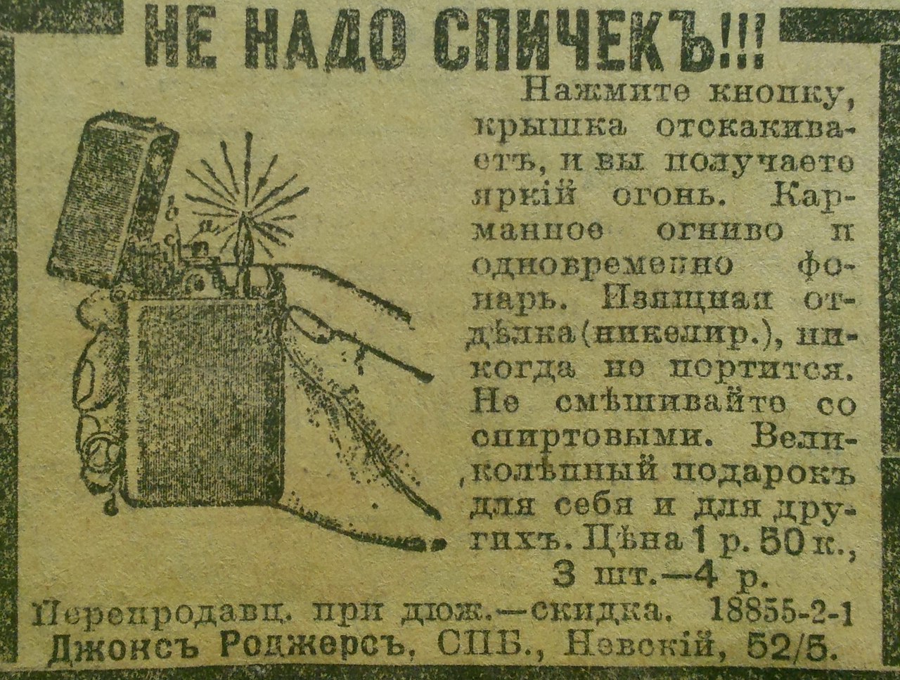 Нажмите кнопку, крышка отскакиваетъ, и вы получаете яркiй огонь. Карманное огниво и одновременно фонарь