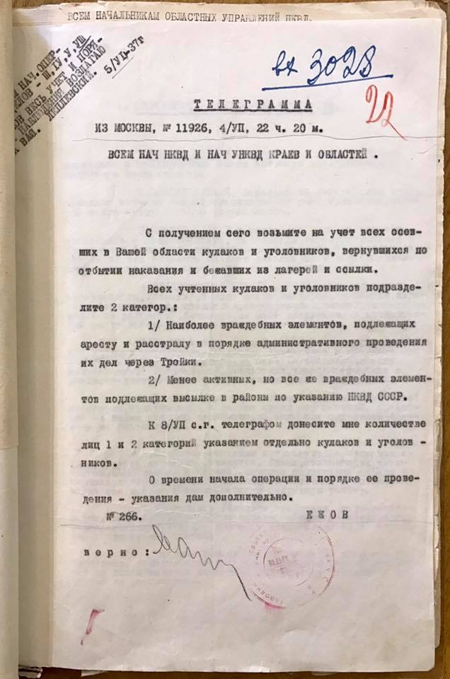 Телеграмма за подписью Николая Ежова, отправленная из Москвы в УНКВД Харьковской области 4 июля 1937 года. С нее и с секретного оперативного приказа №00447 фактически начался Большой террор: