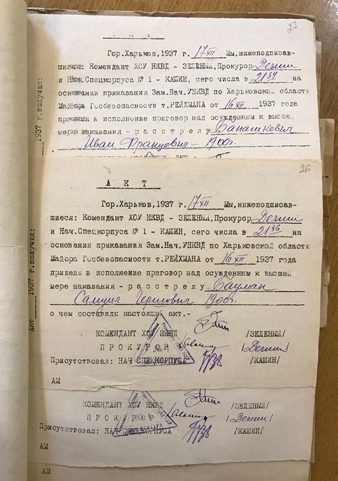 – Да, там много документов об исполнителях расстрелов. Например, о таком человеке, как Артём Петрович Зелёный. О нем известно немногое: он был комендантом Харьковского УНКВД и одновременно основным исполнителем приговоров. Я видел своими глазами и листал 15 томов, в которых находятся только акты о расстрелах, подписанные этим Артемом Петровичем Зеленым. Это 15 толстых томов, не содержащие ничего, кроме этих актов размером с четверть листочка бумаги. "Такой-то расстрелян, комендант харьковского УНКВД Зеленый", и его подпись.
