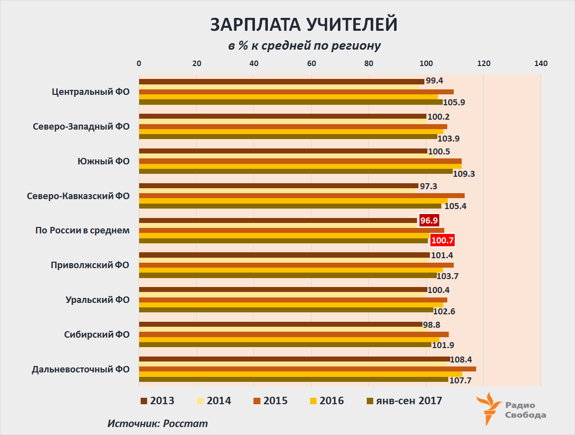 Оценки самих учителей могут разительно отличаться от официальной статистики. Так, по данным Росстата, зарплата учителей общеобразовательных школ за январь-сентябрь 2017 года в среднем по России составила 34 тысячи 27 рублей ($580). А опрос, проведенный "Общественным российским телевидением" в феврале, показал, что средняя зарплата учителя в стране составляет… 18 тысяч рублей в месяц. В 59 регионах из 85, если судить по более чем тысяче сообщений в этом опросе, зарплата составляет 10–20 тысяч рублей. Хотя, понятно, во многих случаях речь могла идти о сумме, которую учитель получает на руки, а не официально ему начисленной, какую учитывает Росстат. Но даже с учетом подоходного налога (13%) разница остается внушительной.