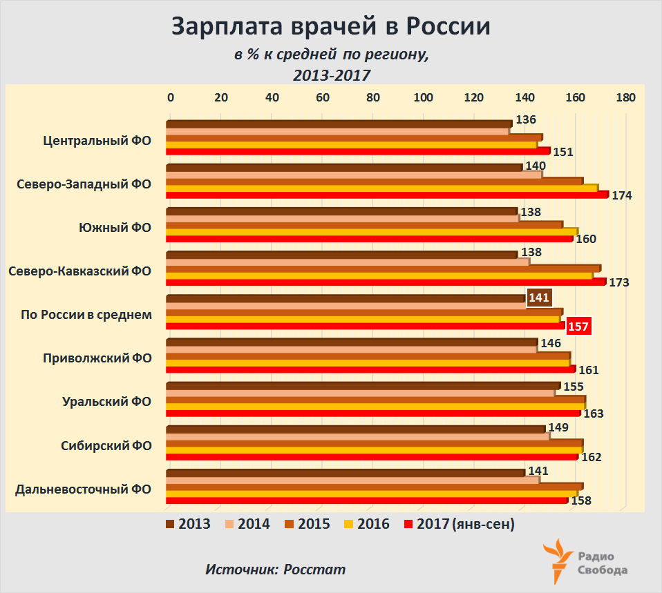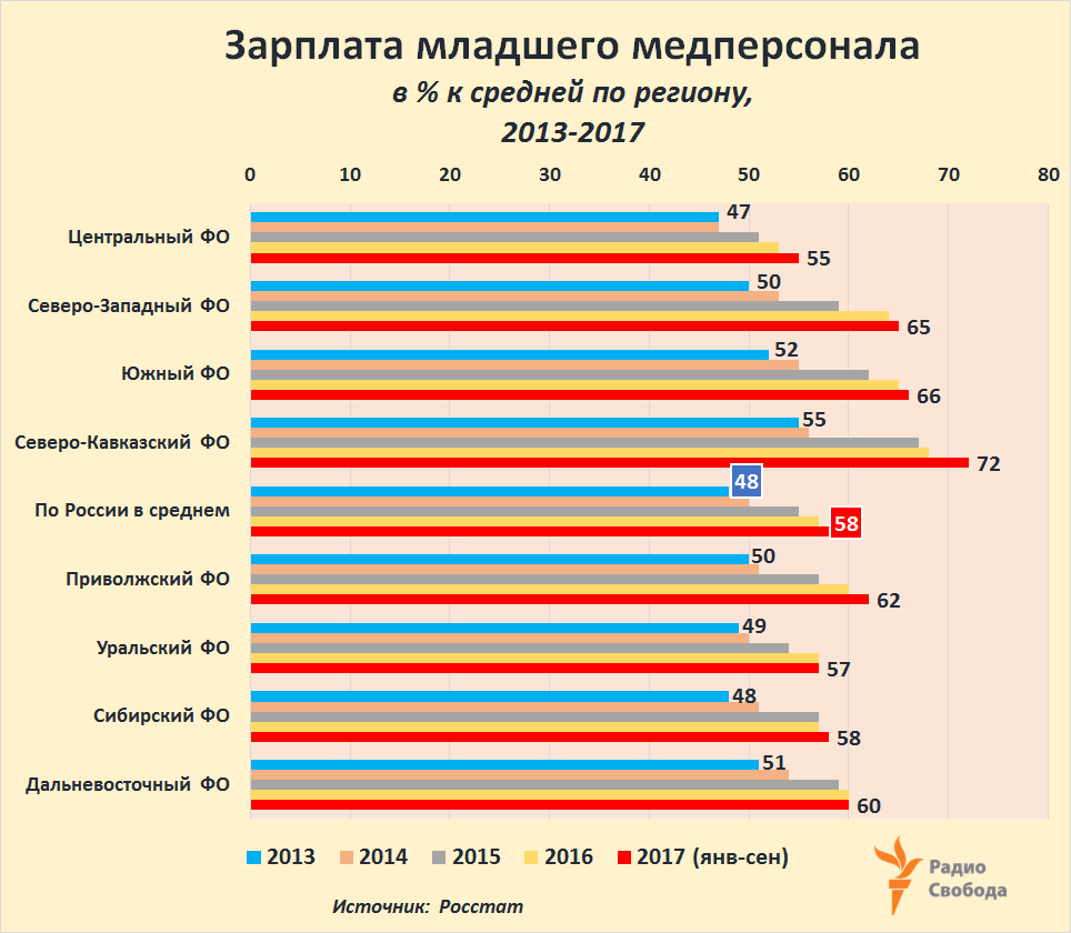 Но самый большой разрыв сохраняется по зарплатам младшего медицинского персонала. Хотя они и выросли почти вдвое за последние пять лет, нынешние зарплаты этой категории медицинских работников остаются значительно ниже средней по регионам, хотя, по “майскому” указу, к 2018 году они должны с ней сравняться: