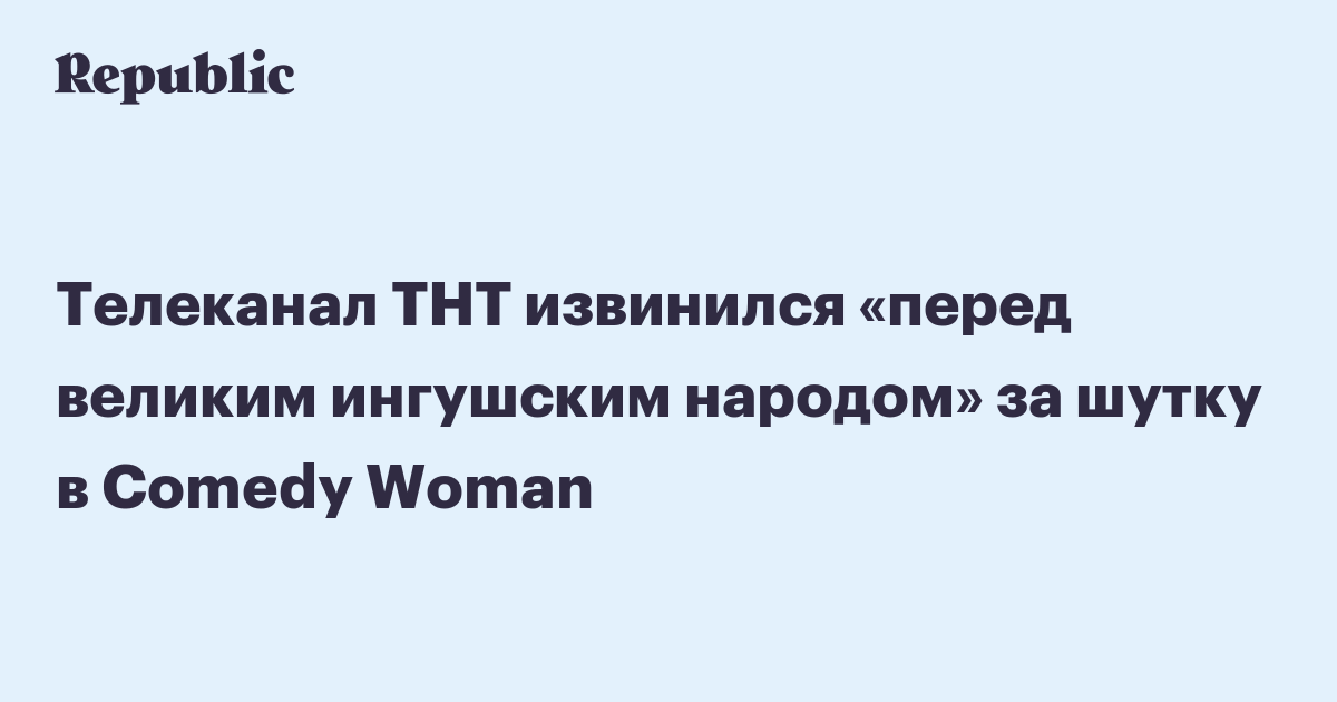 Телеканал ТНТ в своем эфире извинился перед «ингушским народом». Извинение, по всей видимости, принесли за сценку в Comedy Woman – в ней говорилось о девушке из эскорта ингушского происхождения. Ролик с извинением показали только по телевизору, на официальных страницах ТНТ в соцсетях его нет.