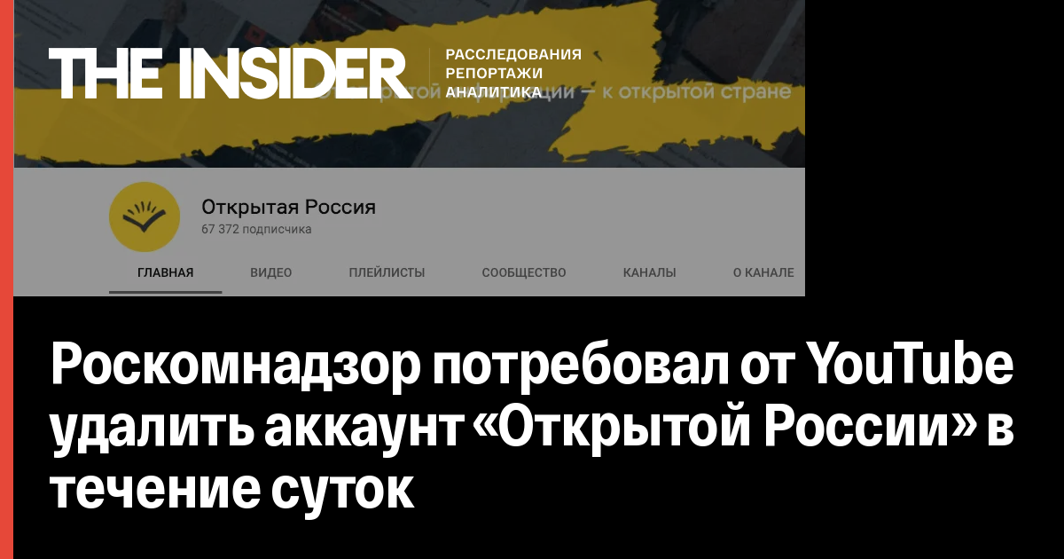 Роскомнадзор потребовал от YouTube удалить аккаунт «Открытой России» в течение суток