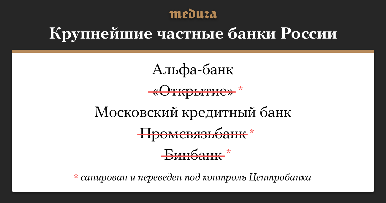 ЦБ объявил о санации Промсвязьбанка (девятое место по величине активов в России, клиенты — 2,5 миллиона физических и 2,7 миллиона юридических лиц). Что осталось от частного банковского сектора? Ответ на этой картинке: