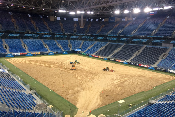 На стадионе «Санкт-Петербург» второй раз за год срезали газон. Вместо него там теперь песок