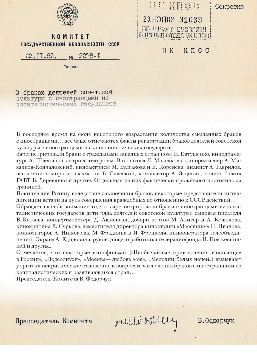 По поступающим в Комитет государственной безопасности СССР данным, в последнее время нередко наблюдаются элементы негативного поведения отдельных категорий зрителей из числа советских граждан, присутствующих на различных международных мероприятиях в области культуры и искусства.