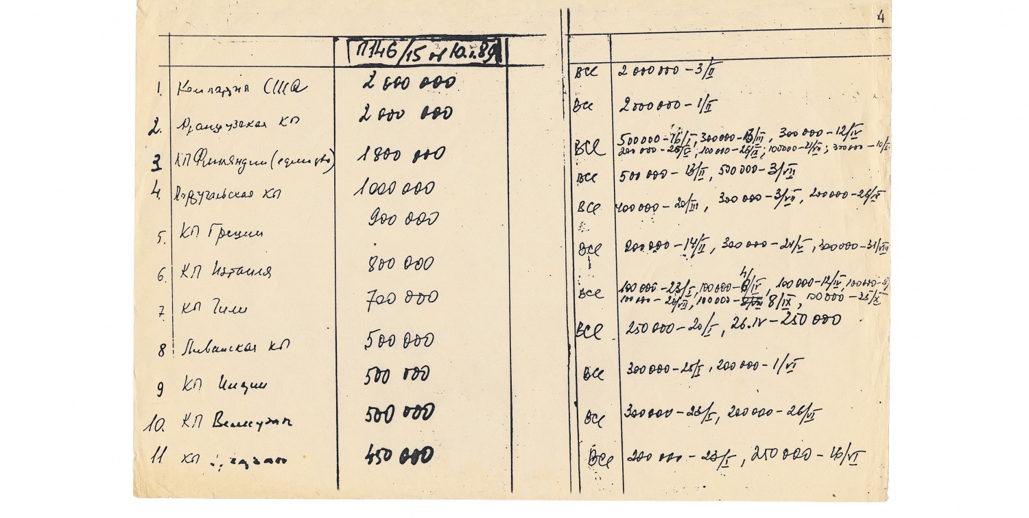 Слева — указания политического руководства страны: каким партиям и какие суммы должны быть переданы.