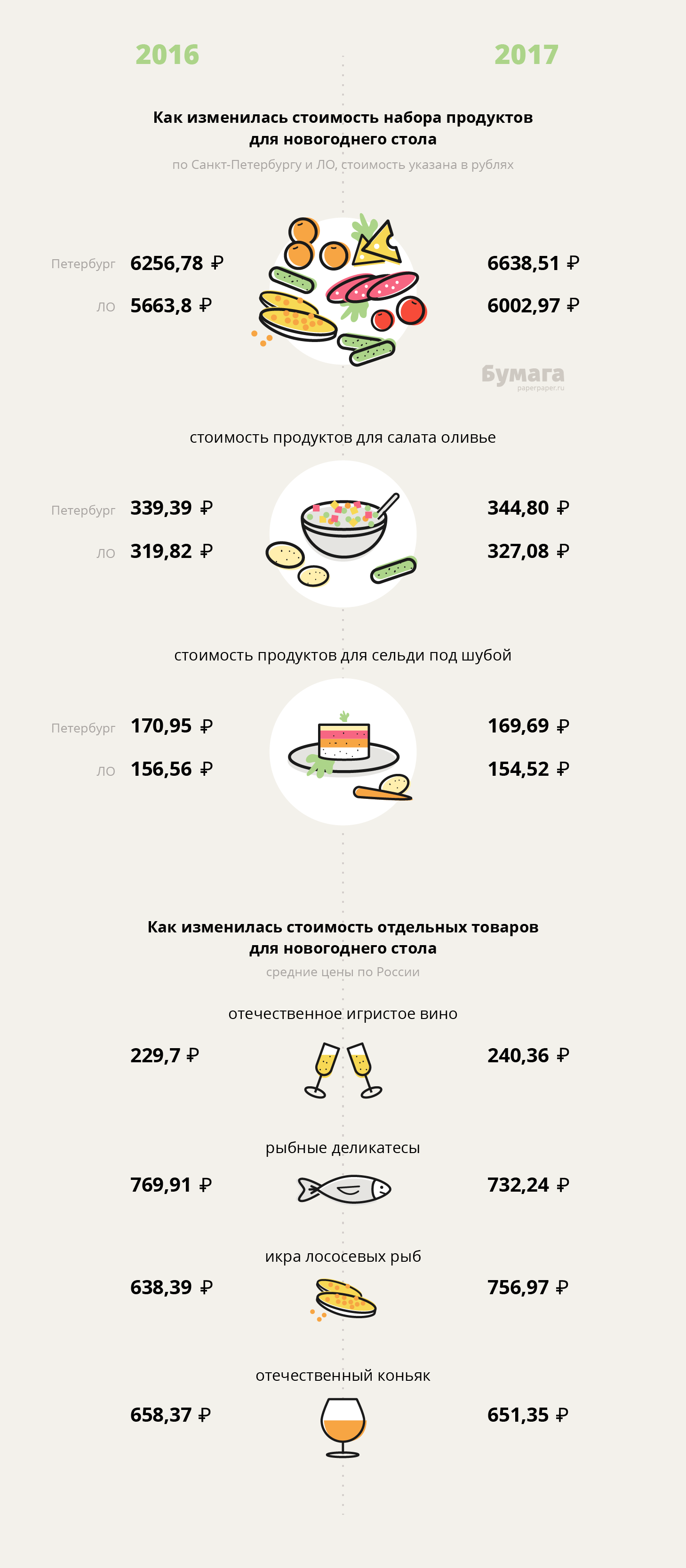 «Бумага» посмотрела, во сколько в этом году в Петербурге обойдется праздничное застолье, что произошло с ценами продуктов для оливье, на сколько подорожала икра и что, наоборот, стало дешевле.
