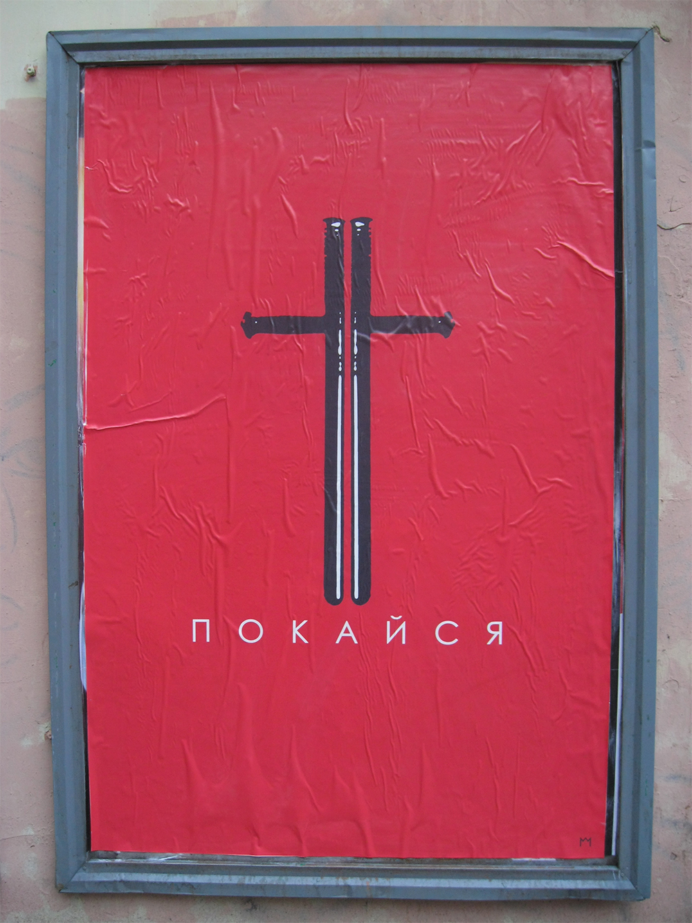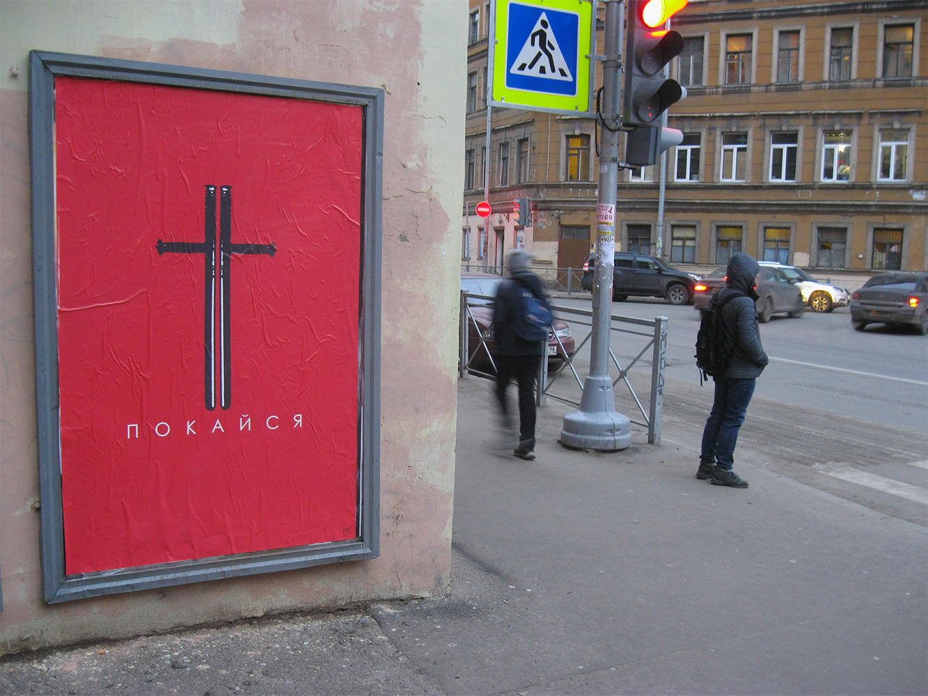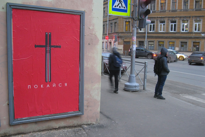 Петербургский художник разместил на Боровой улице картину с надписью «Покайся», на которой изобразил крест в виде сложенных дубинок ОМОНа. Работа находится на пересечении с улицей Константина Заслонова.