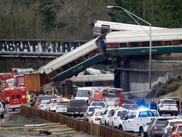 Во время аварии несколько вагонов поезда сошли с рельсов и рухнули на шоссе I-5.