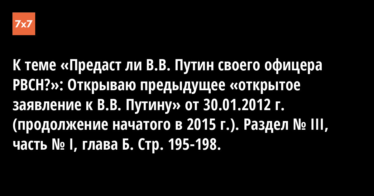 К теме «Предаст ли В.В. Путин своего офицера РВСН?»: Открываю предыдущее «открытое заявление к В.В. Путину» от 30.01.2012 г. (продолжение начатого в 2015 г.). Раздел № III, часть № I, глава Б. Стр. 195-198.