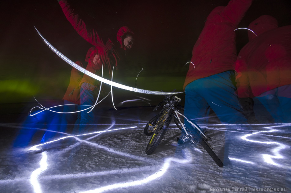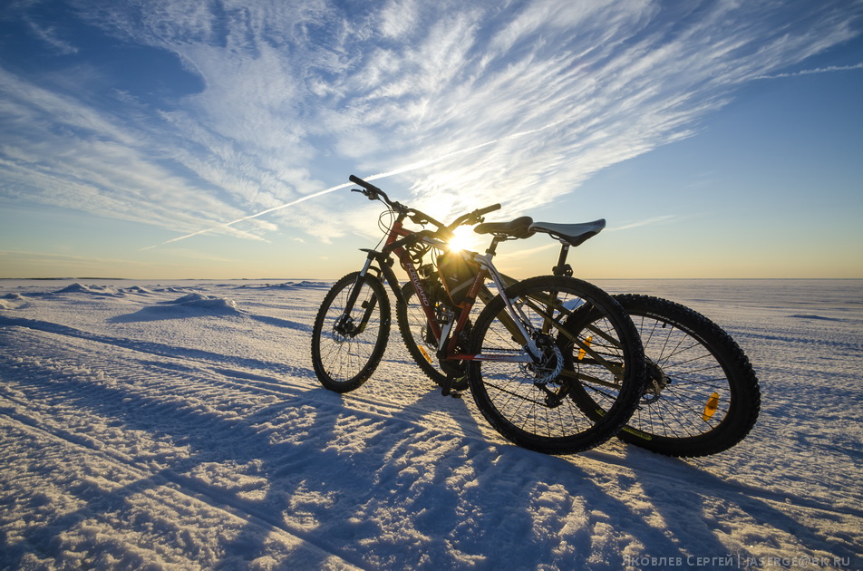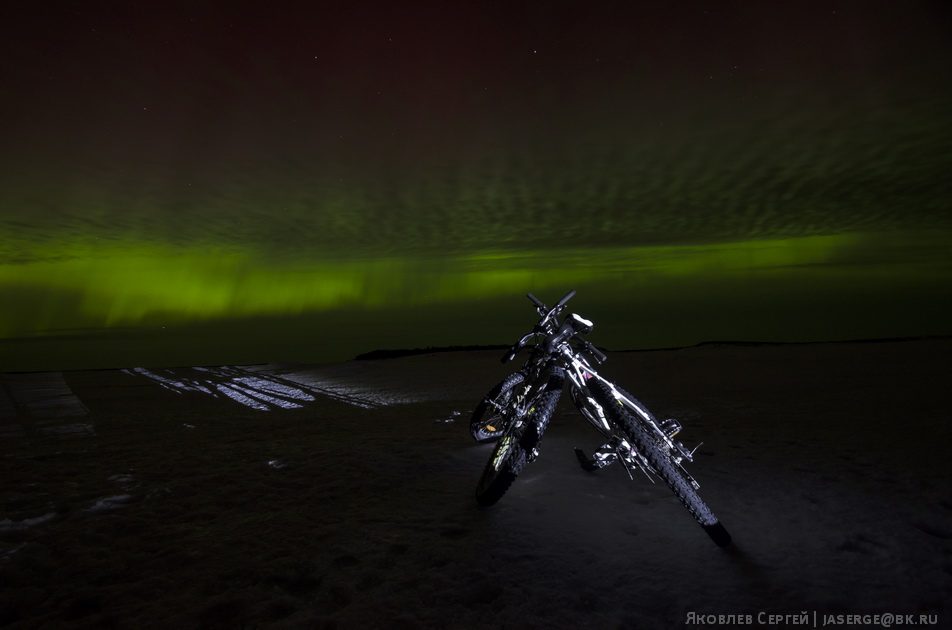 У самого Соловецкого монастыря довольно сильная засветка и смотреть сияния не всегда интересно, поэтому была выбрана довольно необычная точка — остров Большой Заяцкий. Вся трудность этого выбора в том, что остров этот в 4 км по прямой от поселка, а Белое море не всегда замерзает прочно у этого острова, тем более обратно возвращаться пришлось бы по полной темноте. Но кто не рискует, тот не получает редкие кадры (и, кстати, не тонет в холодной арктической воде). Отправляемся на Заяцкий остров на велосипедах.