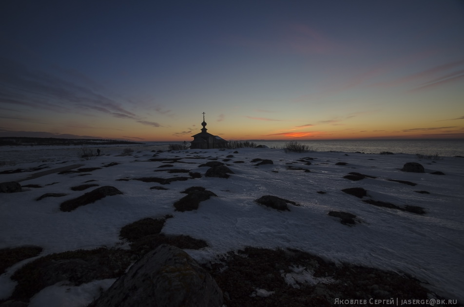 Вокруг острова полоса открытой воды, по которой носит большие и малые льдины. Отступать назад уже стыдно и приходится перепрыгивать по льдинам на берег острова. Последние отблески солнца мы уже хватаем над храмом во имя Андрея Первозванного.