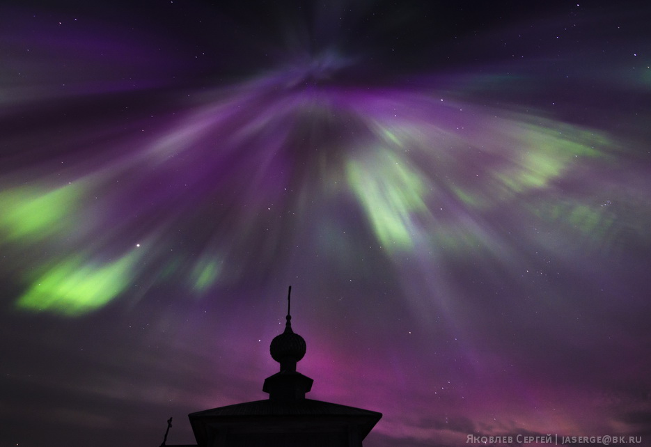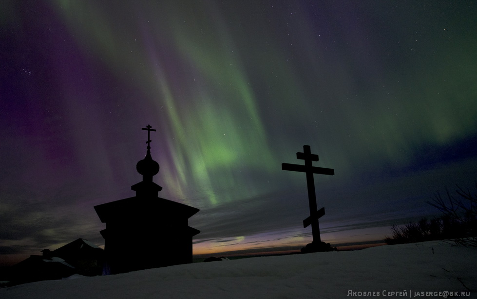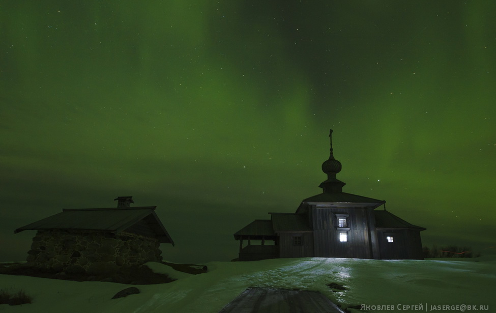 Но иногда случается такое, что даже самые замшелые домоседы, отправляются полюбоваться природой. Один из таких случаев произошел в ночь с 17 на 18 марта 2015 года. Природа обрадовала большую часть россиян мощнейшим полярным сиянием, которое было видно даже на юге страны. Снимать такое действо в «попсовых» точках было бы грешно и непростительно, поэтому были выбраны далекие Соловецкие острова в Белом море, а именно Большой Заяцкий остров, где расположена древняя деревянная церковь XVII века и загадочные каменные лабиринты.