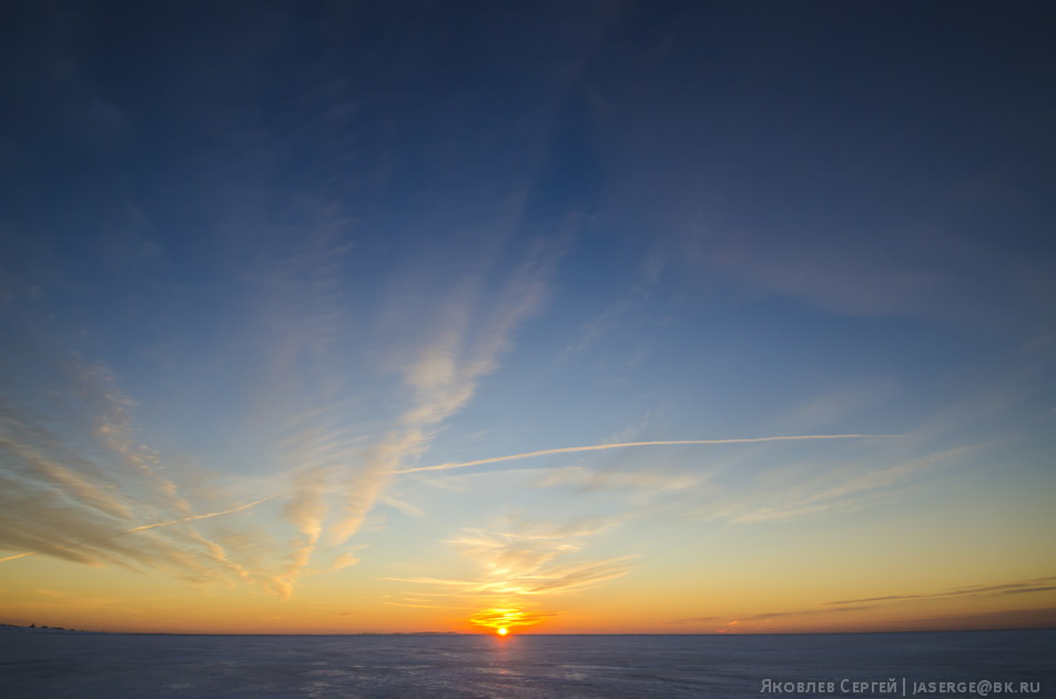 В пути встречаем закат. И оглушенные его красотой чуть не влетаем в полынью.