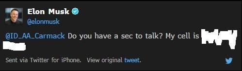 Предприниматель Илон Маск «случайно» опубликовал в своём Твиттере личный номер телефона. Он адресовал сообщение бывшему главе ID Software и создателю игры Doom Джону Кармаку. Маск оперативно удалил запись, но журналистка Bloomberg Энн Моффат (Anne Moffat) успела сделать скриншот.