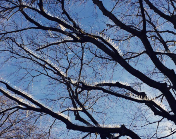 Пластиковые шипы вроде тех, что оказались закреплены на деревьях, используют в общественных местах с аналогичной целью — не дать птицам сесть на ветку, чтобы уберечь пешеходов от помёта.