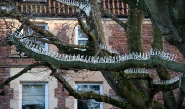 Жительница Бристоля Дженнифер Гарретт (Jennifer Garrett) опубликовала в Твиттере снимок, сделанный её знакомой в одном из престижных районов города. В кадр попали деревья с закреплёнными на них длинными шипами — так владельцы участков лишили птиц возможности сесть на ветки и защитили автомобили от помёта.