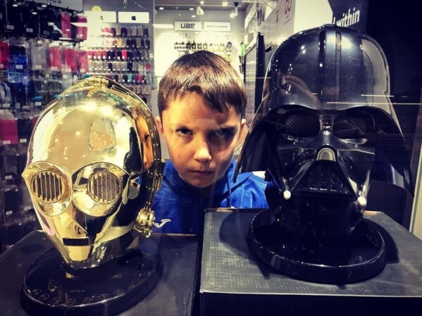Мы вместе посмотрели один фильм. Он сразу попросил игрушки и лайтсайбер, световой меч. Ему было около 4-5 лет. Как только он узнал о существовании «Звёздных войн», он моментально пересмотрел все эпизоды по несколько раз и выучил почти все диалоги. Спросите его о любом герое — он знает всё, настоящий фанат.