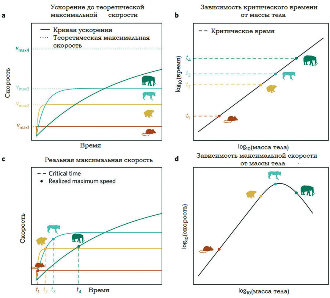 Ученые создали модель, которая учитывает массу мышц и всего тела; время, необходимое для достижения максимальной скорости; и наличные запасы энергии (см. рис. 1). Чем больше мышечная масса, тем больше запасы АТФ и время, необходимое для ускорения. Согласно модели, более крупные животные за время разгона могут израсходовать весь АТФ и устанут, так и не достигнув теоретически возможного предела скорости.